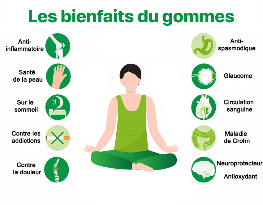 En effet, les gommes aux fruits au peuvent non seulement aider à lutter contre les troubles du sommeil, les maladies de peau et l'agitation intérieure, mais aussi contre un grand nombre de douleurs. Des études ont ainsi pu démontrer que le a un effet anti-inflammatoire, protecteur des nerfs et antispasmodique.
